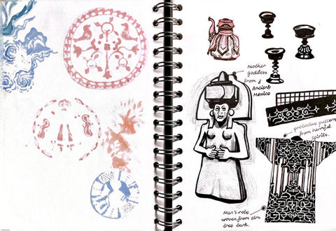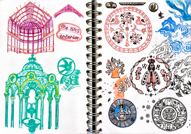 The first design captures mythological and spiritual symbols from Living Lands, evoking native connections to earth and sky. The second, also drawn from Living Lands, celebrates organic harmony through circular, symmetrical shapes. The third pattern design—selected for the final work to be printed—combines delicate details from 20th-century studio artifacts in Making and Creating, weaving multiple artisan elements into one motif.